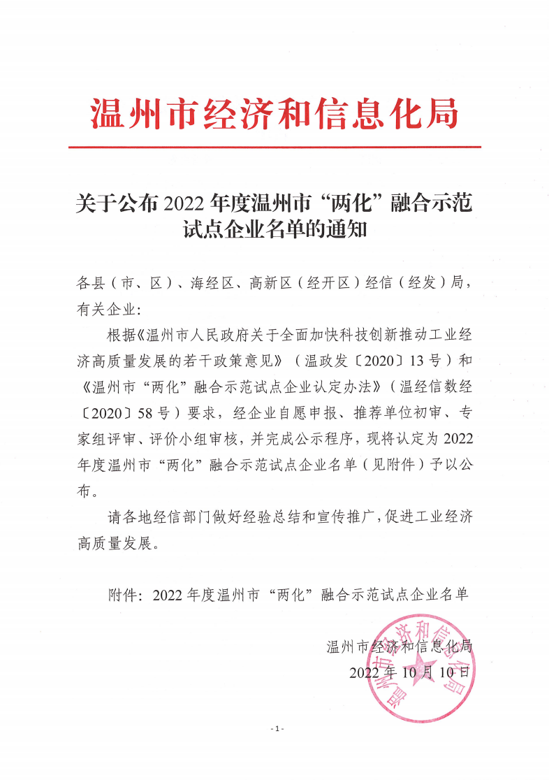 20221010關(guān)于公布2022年度溫州市“兩化”融合示范試點企業(yè)名單的通知